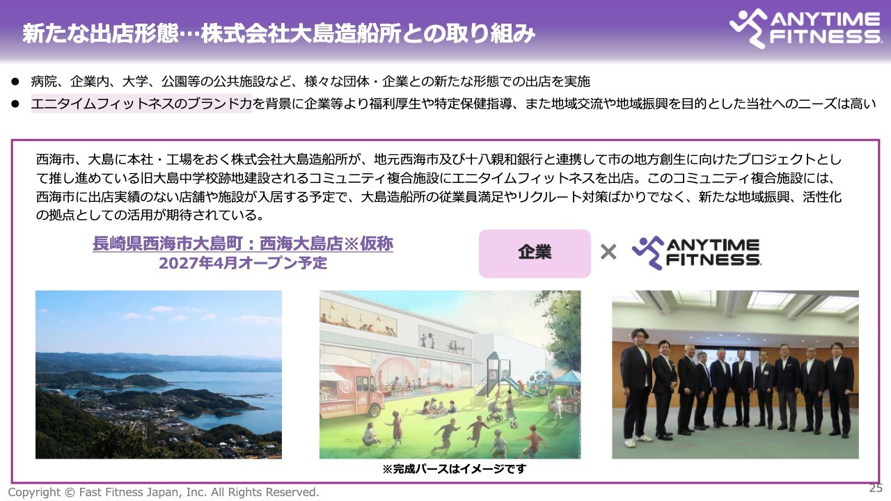 この一環として、大島造船所との協業により、長崎県西海市大島町に「エニタイムフィットネス西海大島店(※仮称)」の出店を計画しています。造船所の一部を利用して展開する店舗で、オープンは2027年4月を予定しています。