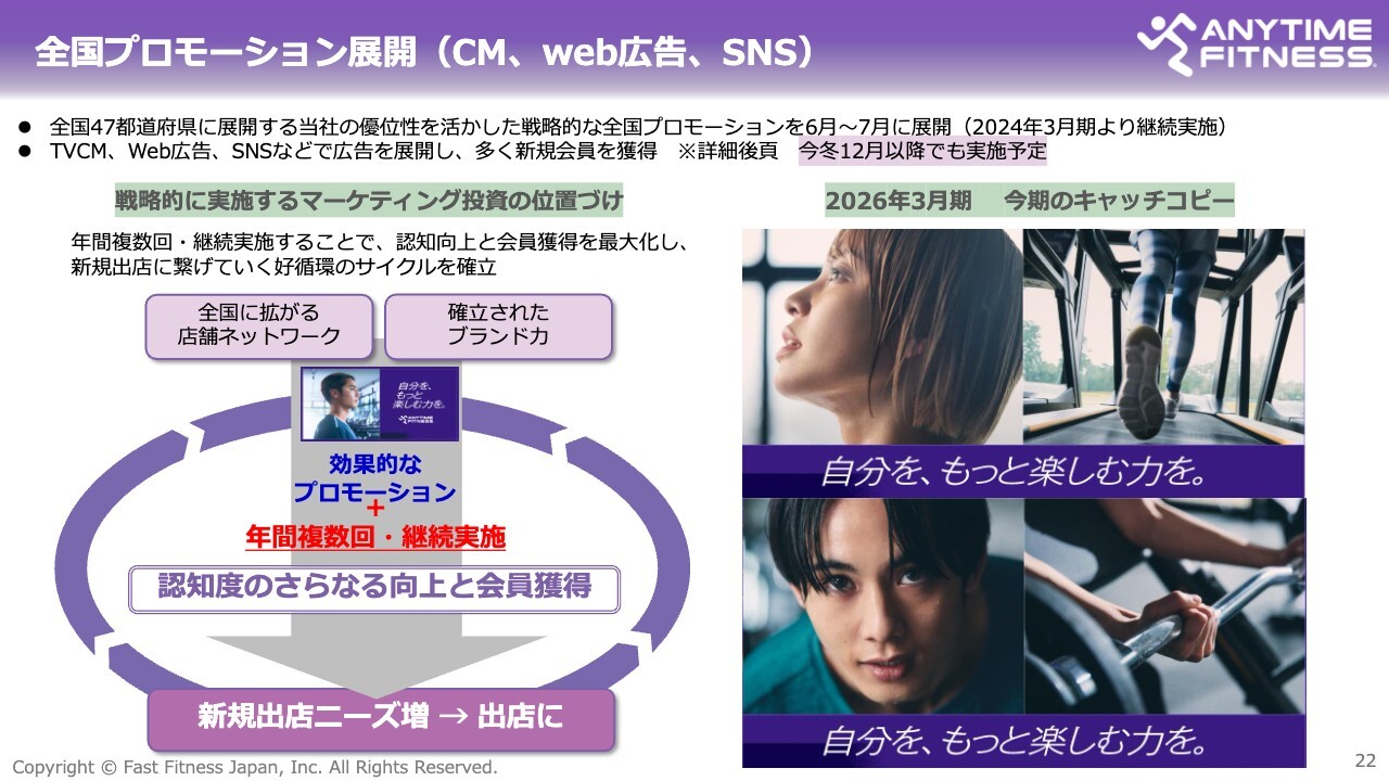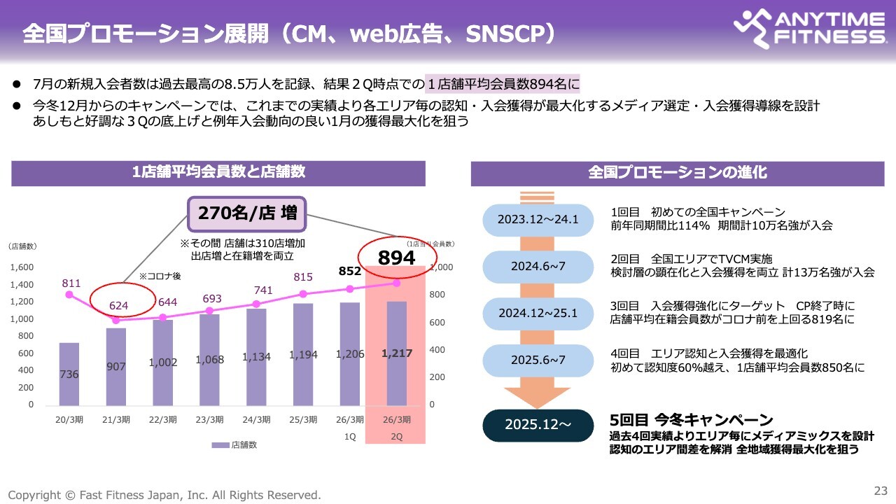 2025年12月以降は、さらなる認知度拡大とブランド強化を目的とした次期フェーズのプロモーションへ移行する計画です。これらの組み合わせにより、1店舗当たりの会員さまの増加を継続的に支え、長期的な成長基盤をさらに強化していきたいと考えています。