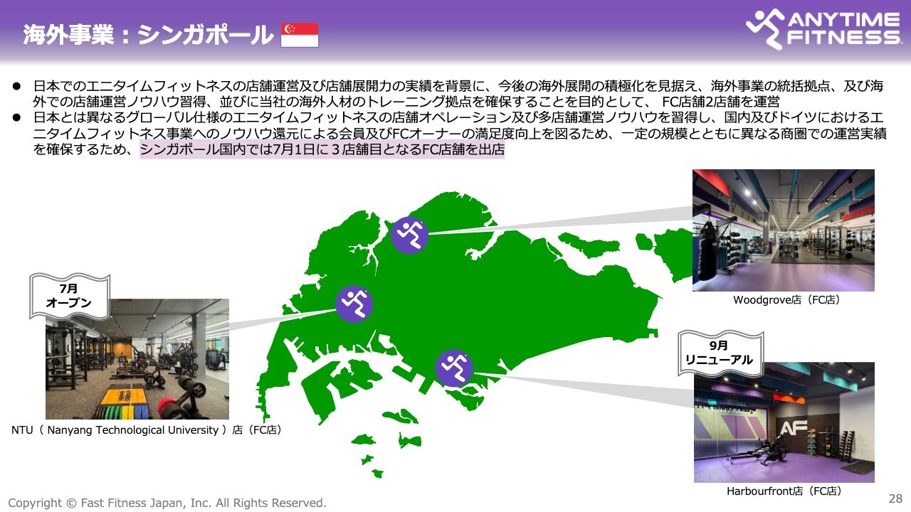 シンガポールについてご説明します。当社は、海外事業の統括拠点として、また新たなノウハウの習得や人材育成の拠点として、シンガポールにあるエニタイムフィットネスのFC店を2店舗取得しました。