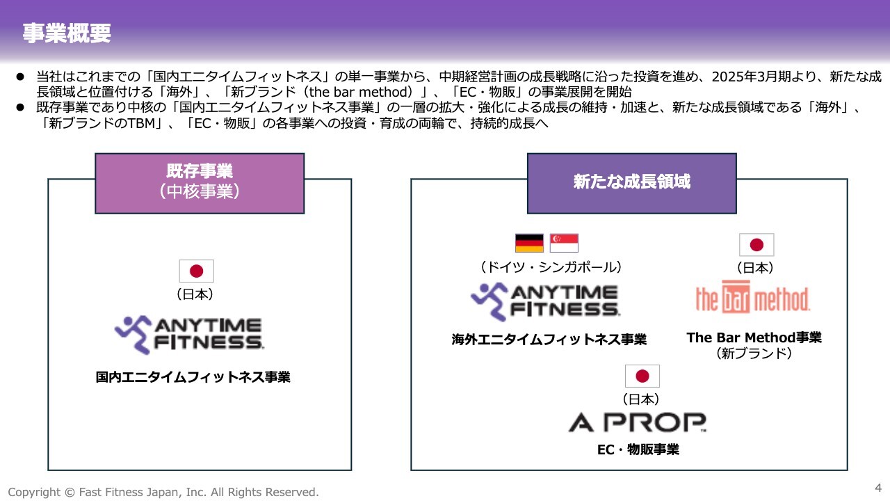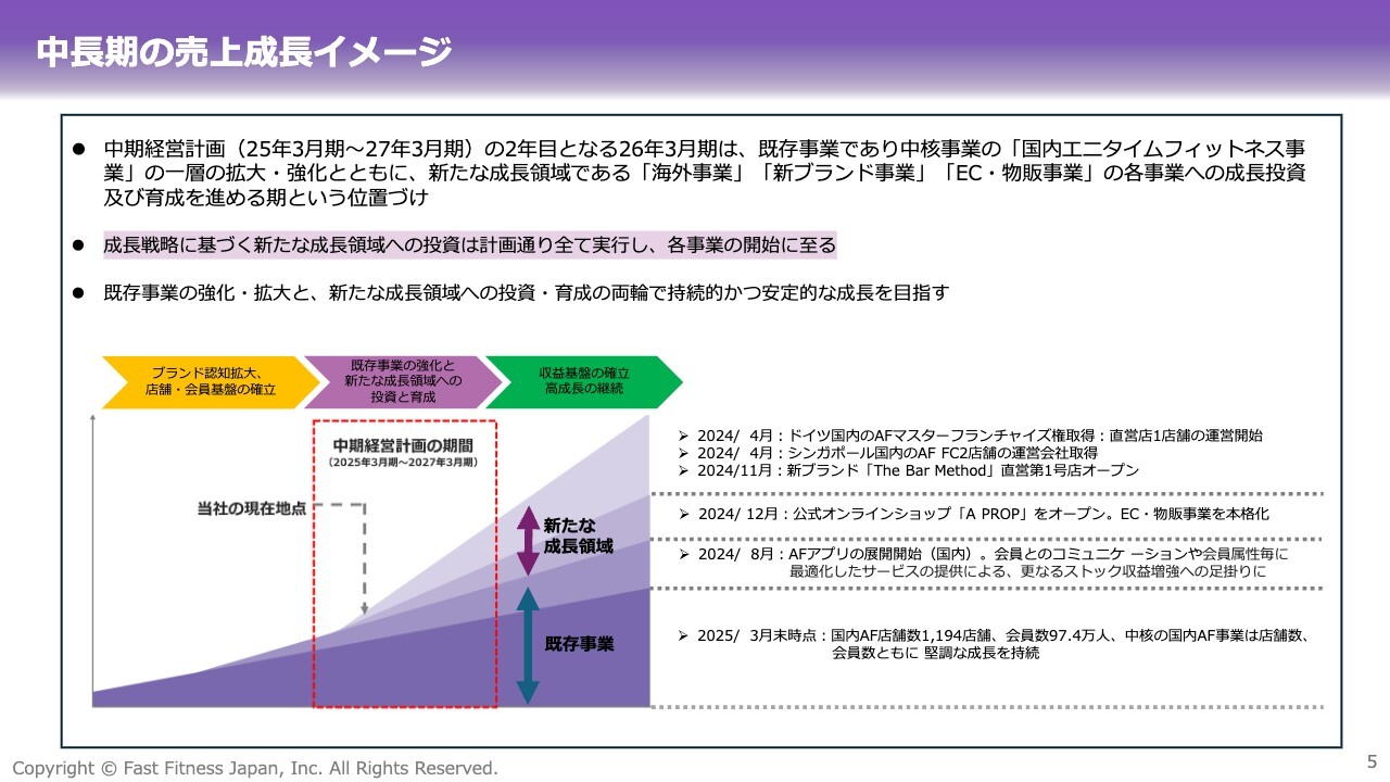 先ほどご説明したとおり、新たな成長領域と位置付ける海外事業、「The Bar Method」、EC・物販の各事業は、昨年度中にすべて事業立ち上げました。今期はそれらの成長に向けた投資を継続しつつ、各事業の育成フェーズに移行しています。