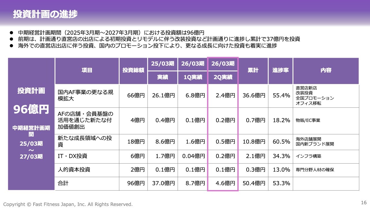 中期経営計画における投資計画の進捗状況です。3ヶ年で総額96億円の成長投資を計画しており、既存店舗の価値向上のための投資、ブランド力を向上させるためのブランド強化、運営効率化の3つの領域に重点的に投資しています。