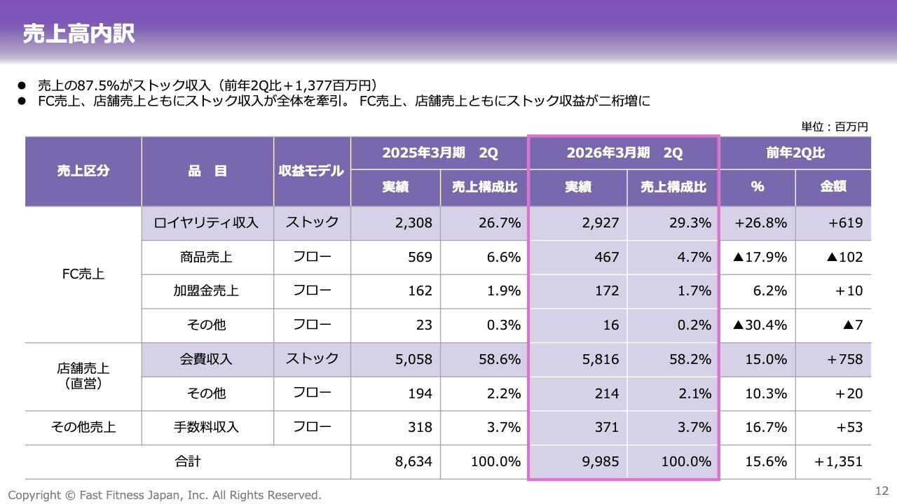 売上高についてです。FC店舗からのロイヤリティ収入と直営店からの会費収入がともに増加し、売上高は前年同期比で増加しています。これらはいずれもストック型の収益で、毎月安定的に収入が得られるモデルですので、店舗数の増加と会員の拡大が大きく寄与しています。非常に安定した成長基盤が続いていると言えるでしょう。