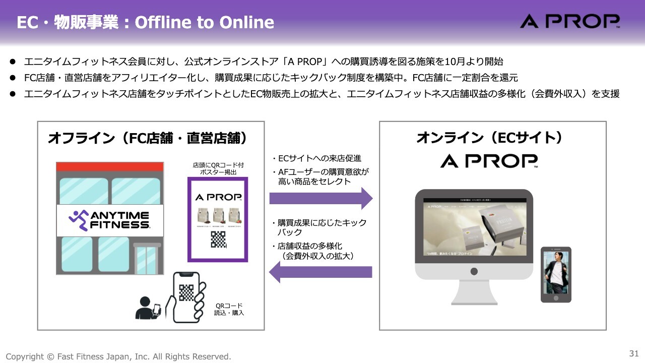 さらに、「A PROP(ア プロップ)」というEC・物販事業です。フィットネス関連商品の販売を通じて、オンライン領域での新たな収益機会の拡大に取り組んでいます。