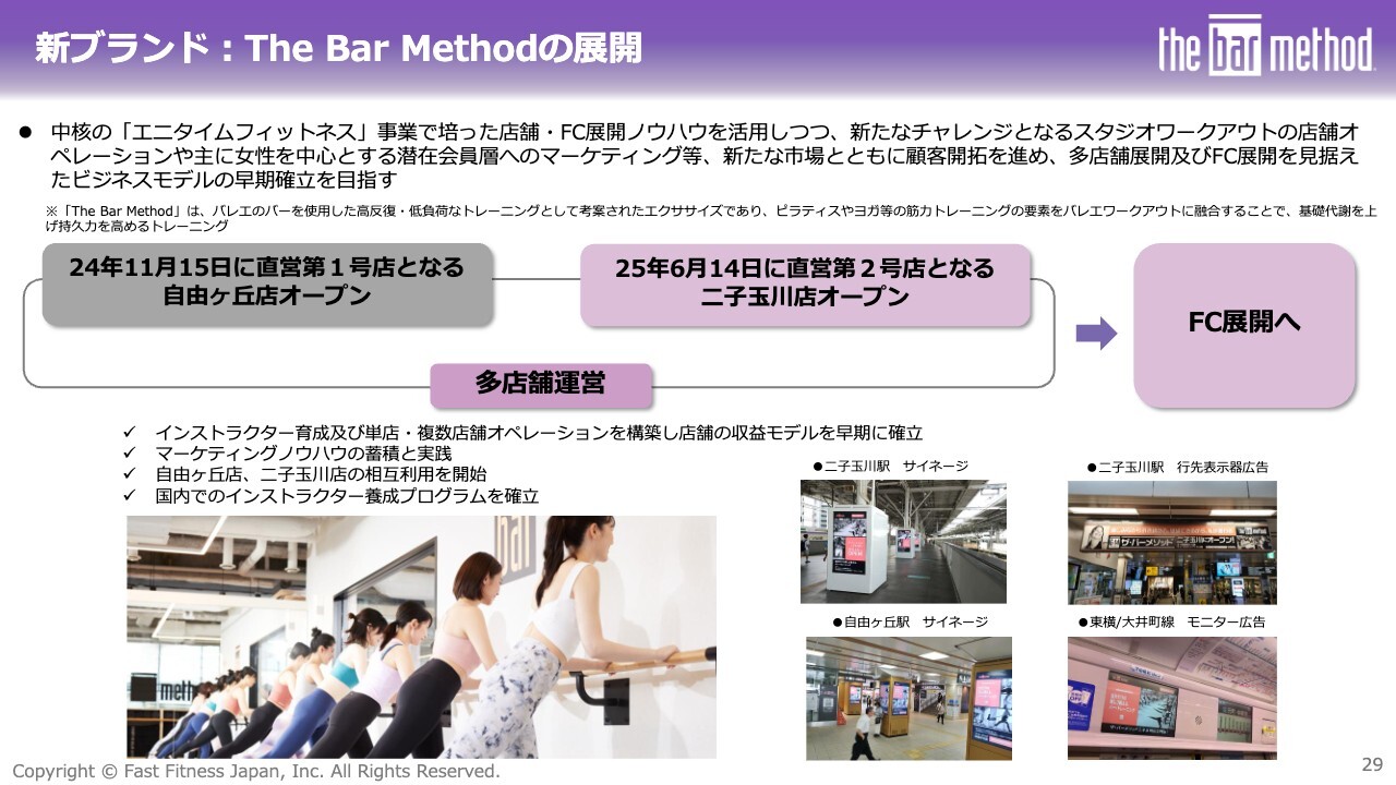 新ブランド事業についてです。スタジオワークアウトの「The Bar Method」を展開しています。昨年11月に自由ヶ丘店、今年6月に二子玉川店をオープンしました。現在、複数店舗で運営体制を整えています。
