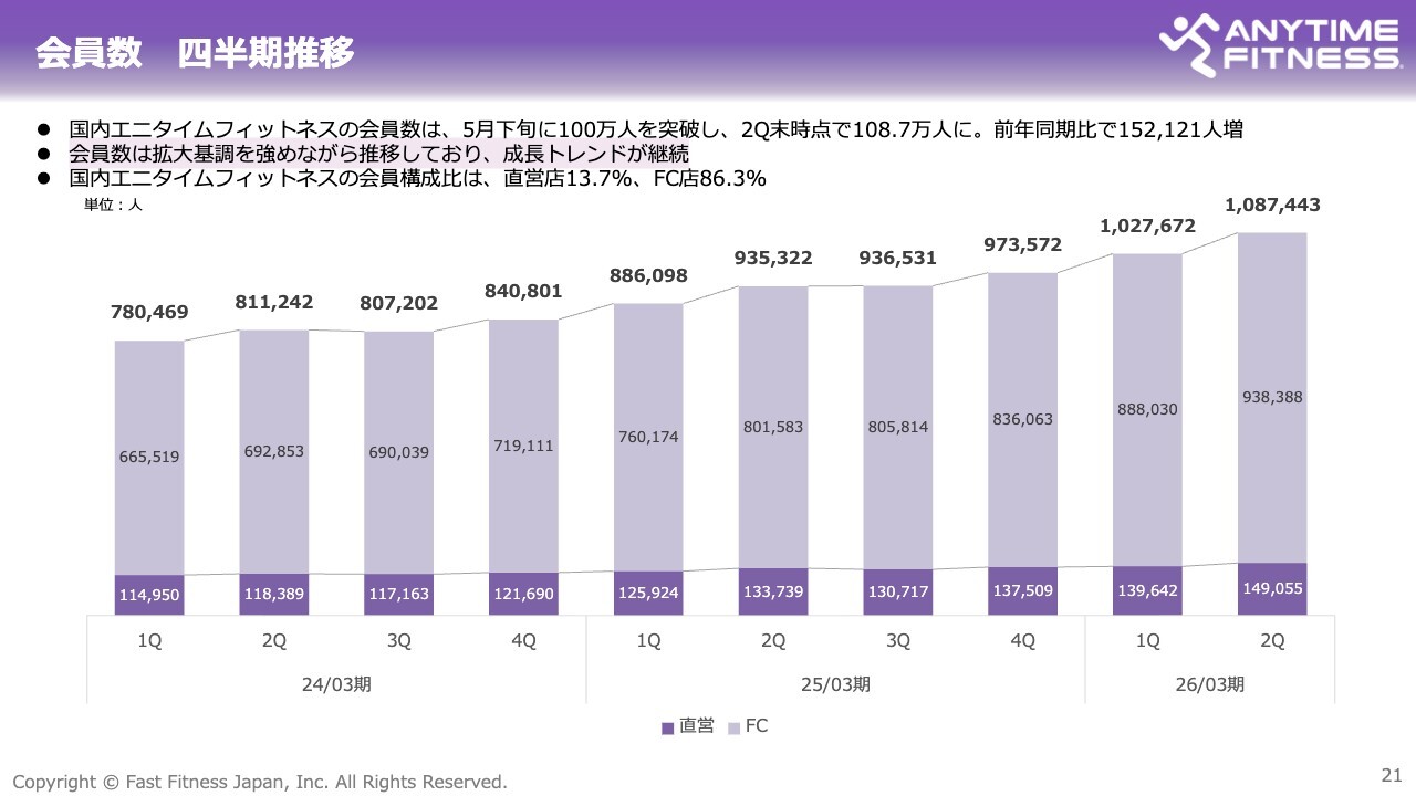 会員数の推移についてです。直営店とFC店を合計した会員数は、四半期を通じて着実に増加しています。2024年3月期の第1四半期では約78万人でした。2025年3月期の第4四半期には約97万人に増加し、さらに直近の2026年3月期第2四半期時点では約108万7,000人に到達しています。この1年間で約15万人以上の会員数の純増となります。