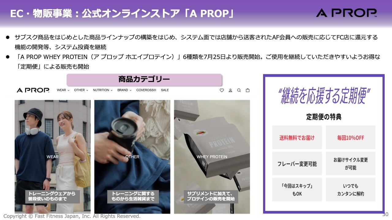 もちろん、エニタイムフィットネスの会員さまとの親和性も考慮し、オリジナル商品も多数展開しています。今年7月には、「A PROP WHEY PROTEIN」というプロテインを投入したばかりです。定期販売の機能を実装し、EC・物販事業の強化を図っています。