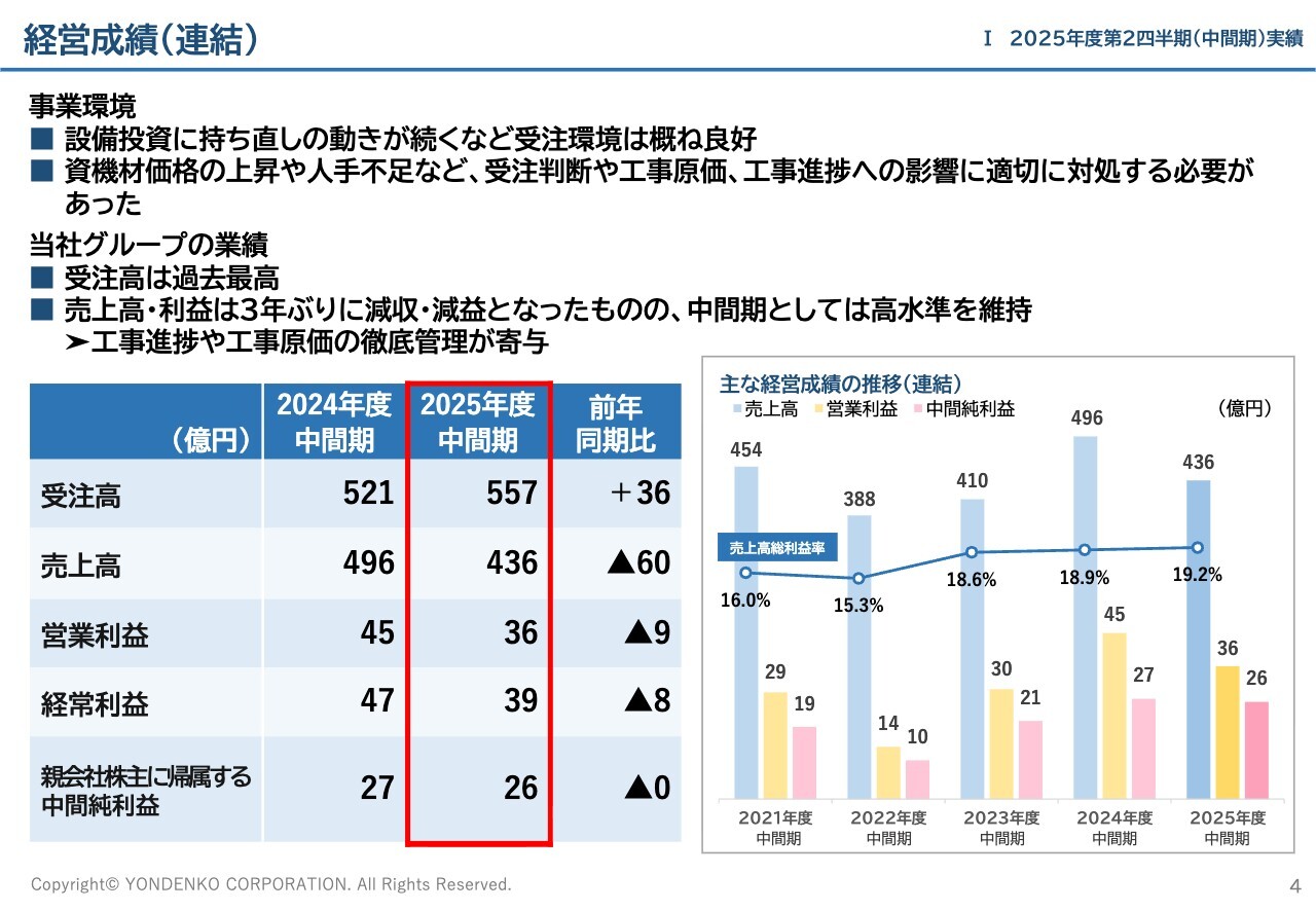 中間期までの事業環境については、受注環境は概ね良好であり、受注高は過去最高となりましたが、前年同期の大型工事の反動減などにより3年ぶりに減収・減益となりました。