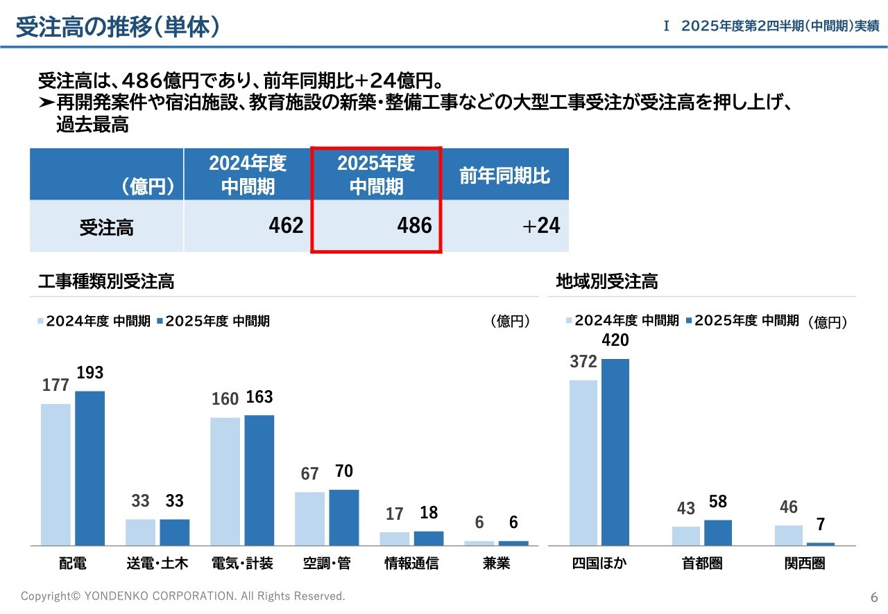 続いて、四電工単体の業績についてご説明します。初めに、受注高です。前年同期と比べ24億円増加し、486億円となりました。