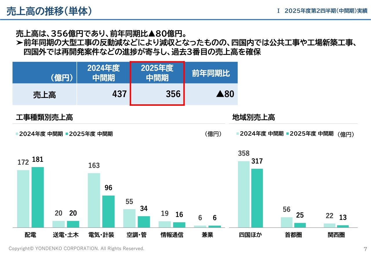 売上高の推移です。先ほどお伝えしたとおり、大型設備工事は工期の終盤にかけて売上が上がる傾向にあり、前年同期には工期終盤の大型工事が売上に貢献したのに対し、今年度は、新たに着工した大型工事が初期段階にあったため、前年同期と比べると減収となりましたが、四国内の公共工事や工場新築工事、四国外の再開発案件などは順調に進捗しており、売上高は過去3番目の高い水準にあります。