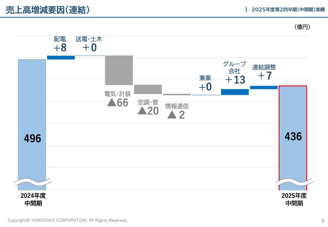 ブルーが増加要因、グレーが減少要因を示しています。配電工事やグループ会社などで増収となりましたが、電気・計装工事、空調・管工事に関しては、前年同期は竣工間近の大型工事が売上増に寄与したのに対し、今期は比較的初期段階の工事が多かった影響により減収となり、全体では60億円の減収となりました。