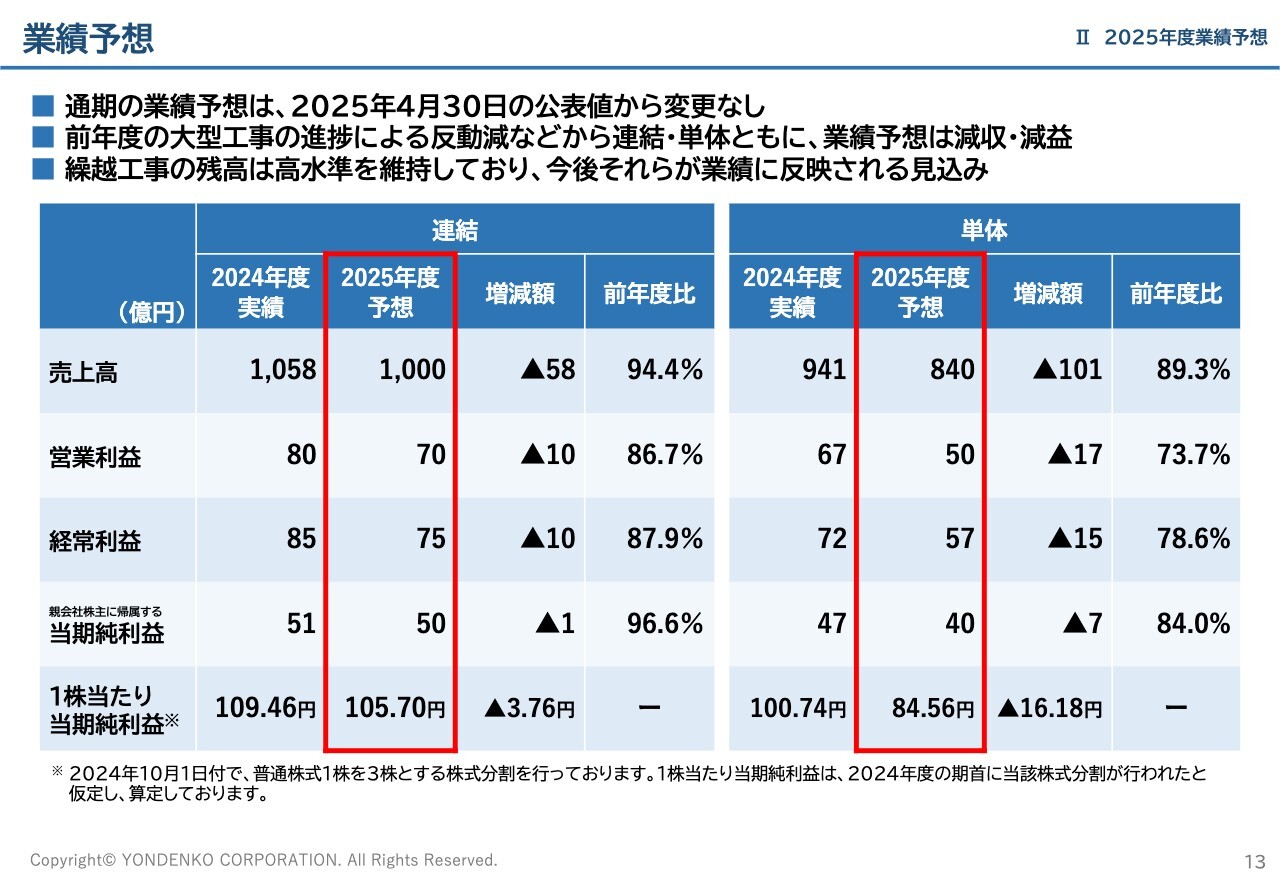 連結・単体ともに減収・減益としていますが、繰越工事の残高は高水準を維持しており、 今後それらが業績に反映されるとみています。