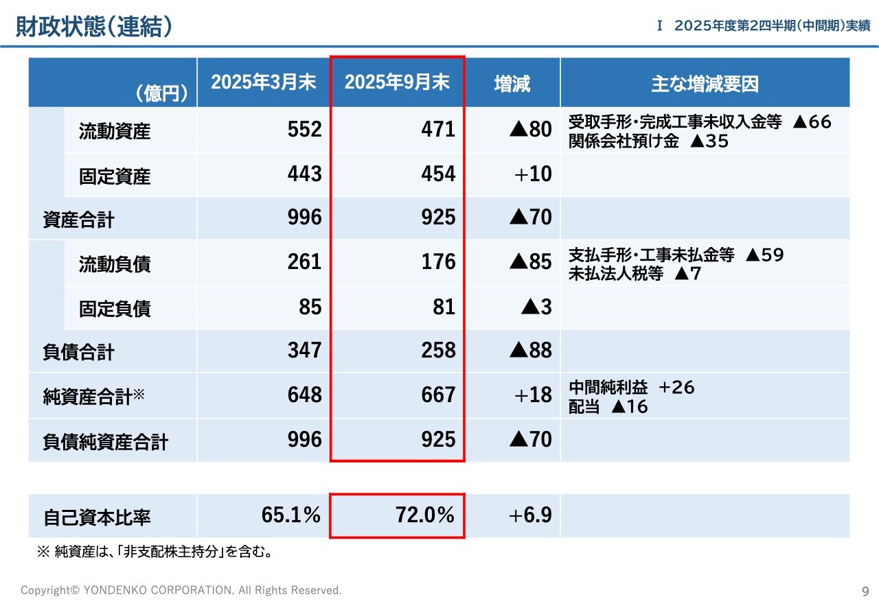 資産は前年度末に比べ、受取手形・完成工事未収入金等の減少などにより70億円減の925億円となりました。