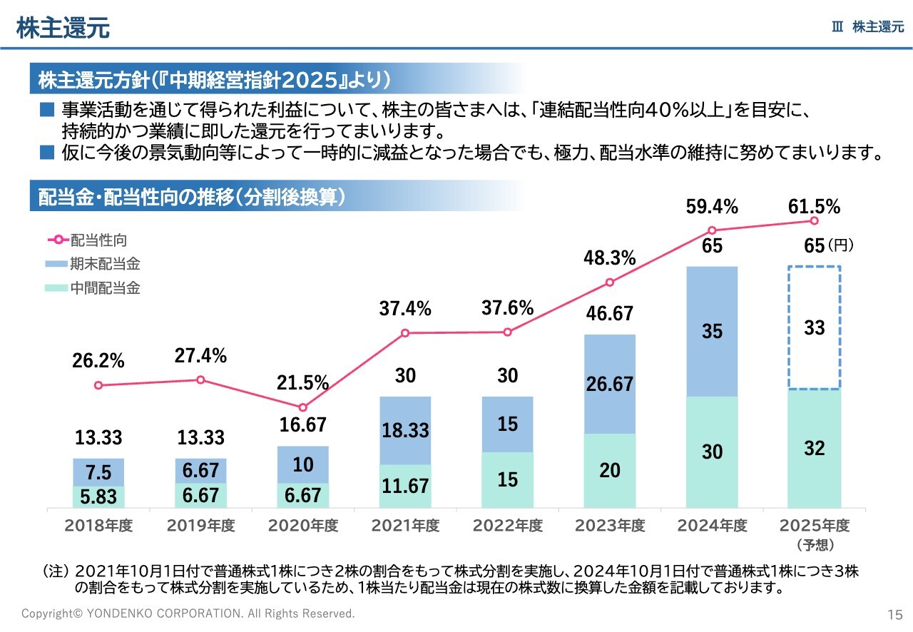 2025年度の業績予想については、減収・減益としていますが、配当については、中間配当32円、期末配当33円と、前年度と同額相当の年間配当65円を予定しています。