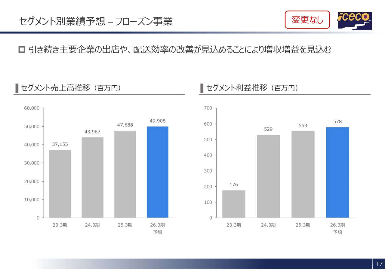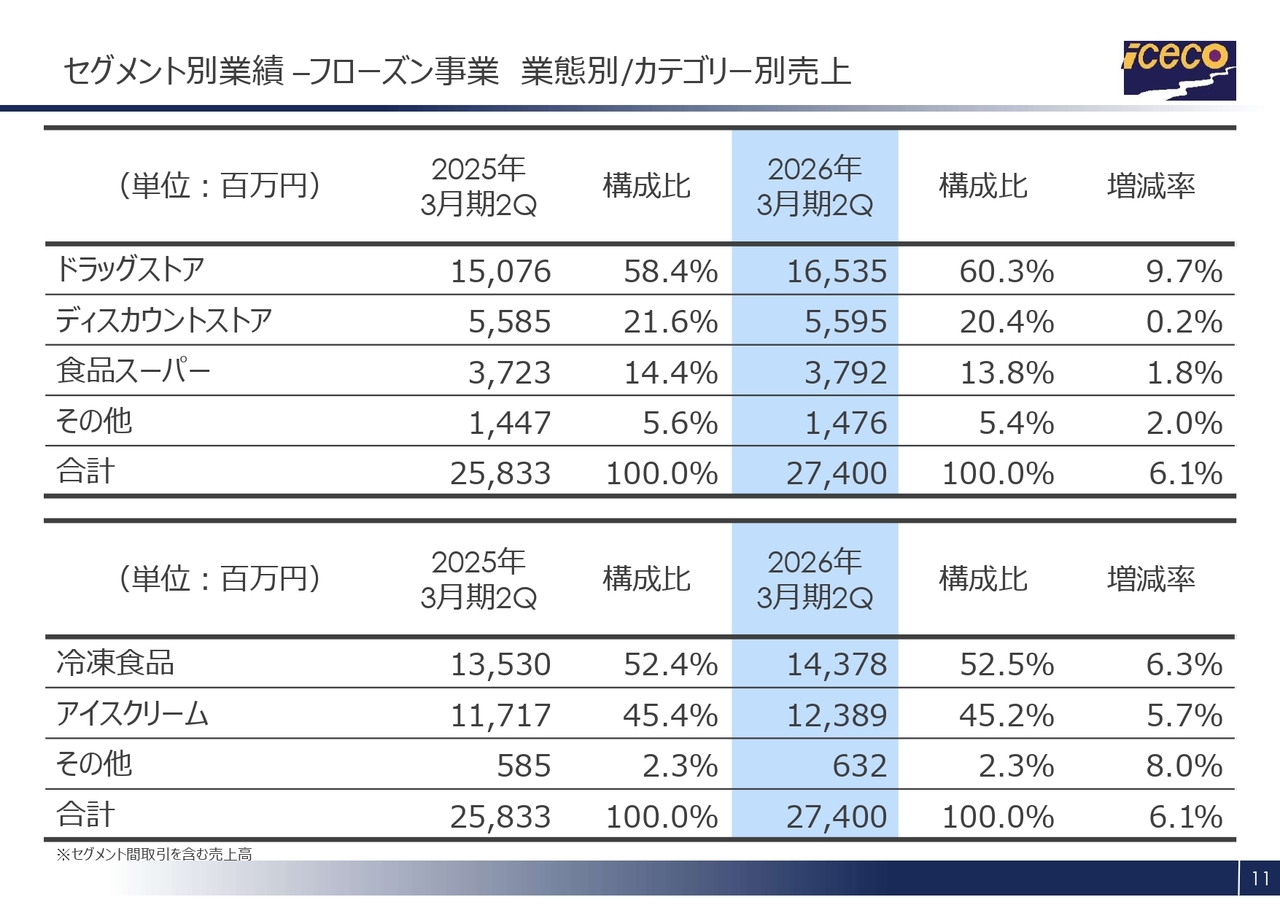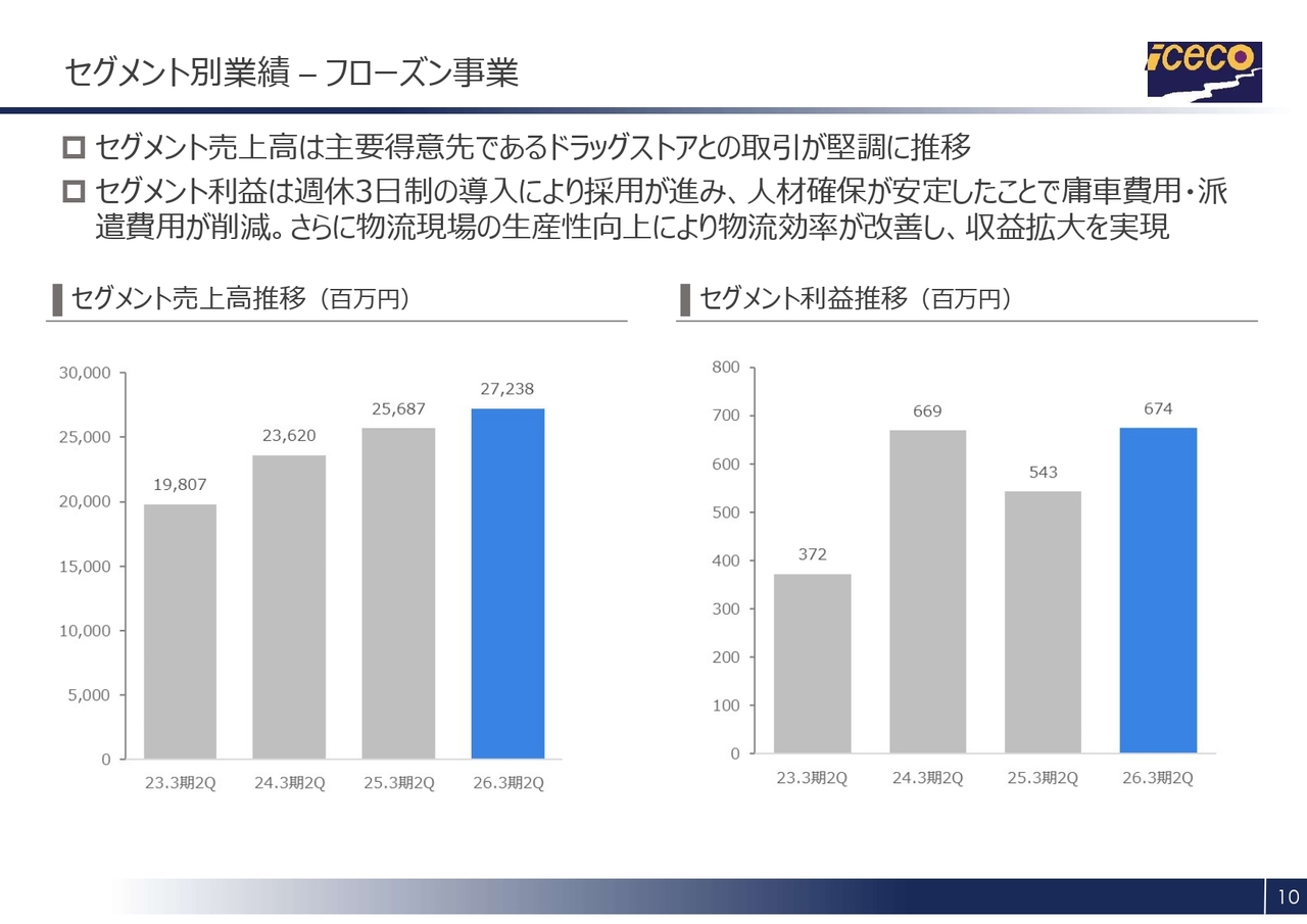 セグメントごとの業績についてご説明します。まずは、フローズン事業です。セグメント売上高については、昨年10月に主要ドラッグストアの帳合変更が通年で寄与しました。加えて、主要得意先による新規出店が堅調に推移したことで、全体として順調に拡大しました。