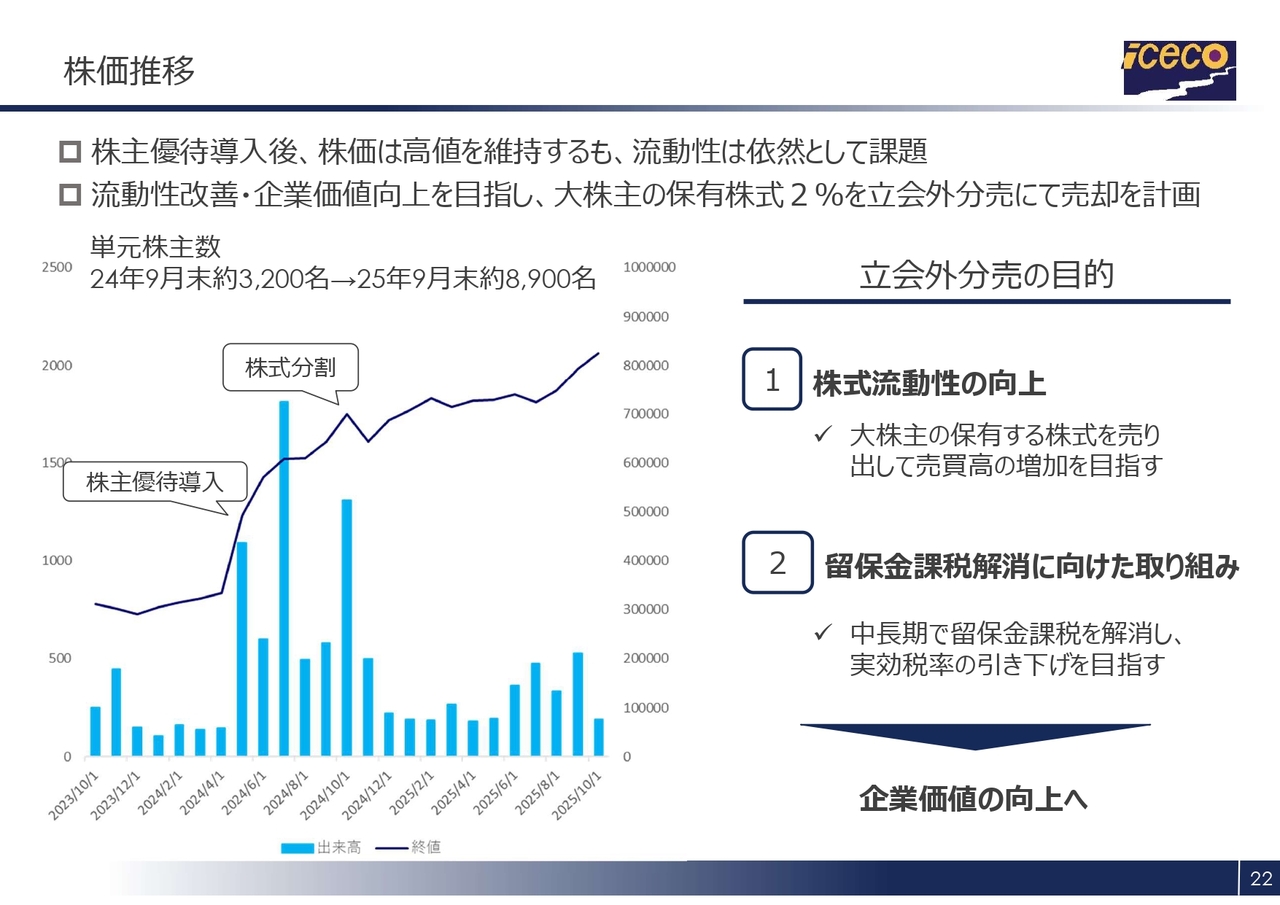 一方、出来高については依然として改善の余地があると考えています。当社のように大株主が過半数を保有している場合、株式の流動性が相対的に低くなる傾向があります。また、留保金課税の適用により税率が高くなる点も課題として認識しています。