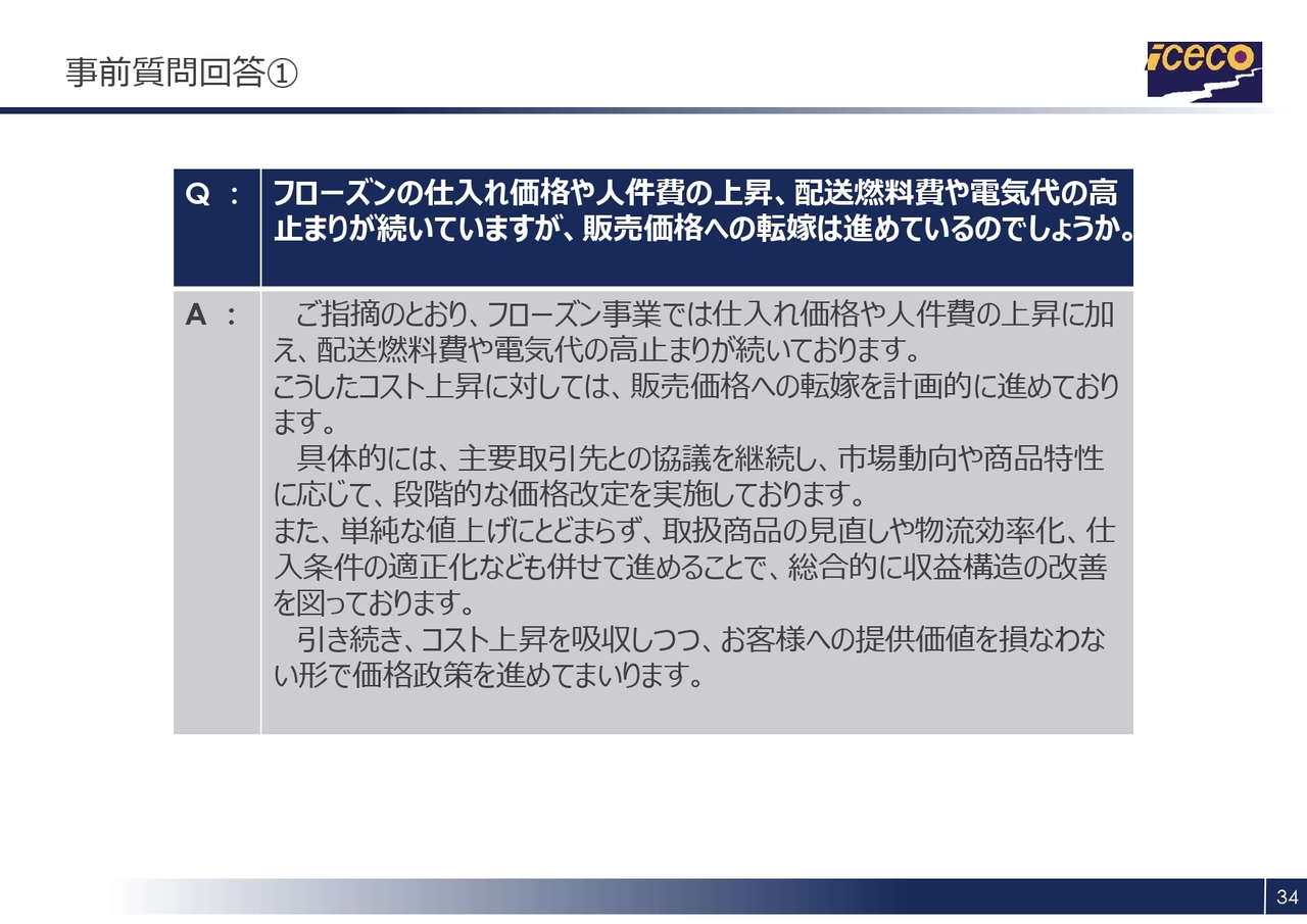 ご指摘のとおり、フローズン事業では仕入価格や人件費の上昇に加え、燃料費や電気代の高止まりが続いています。これらのコスト上昇に対しては、販売価格への転嫁を計画的に進めており、具体的には、主要な取引先と協議を重ねつつ、市場動向や商品特性に応じて段階的な価格改定を実施しています。