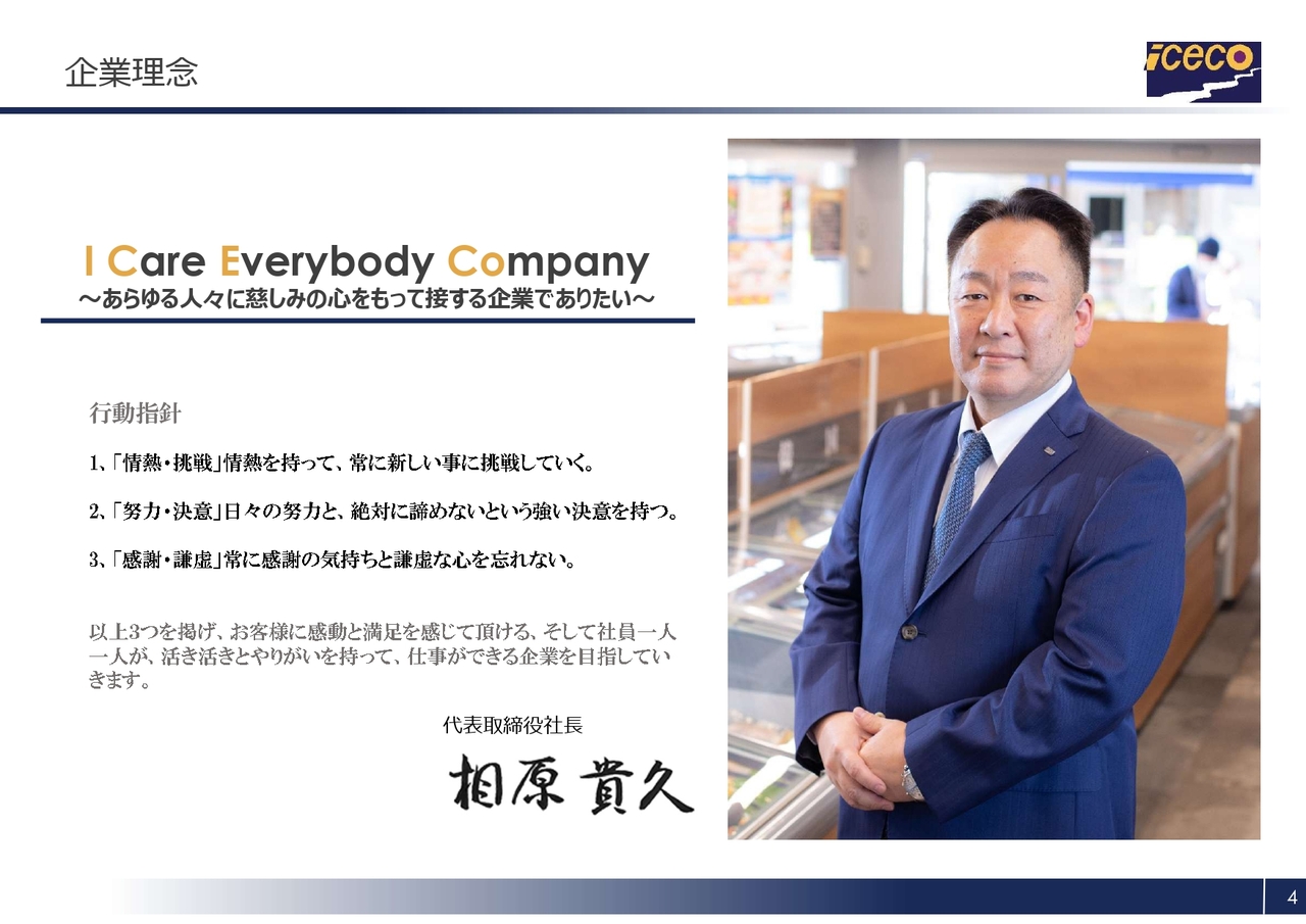 スライドのオレンジ色で示された部分の頭文字を取り、「ICECO(アイスコ)」という社名になっています。