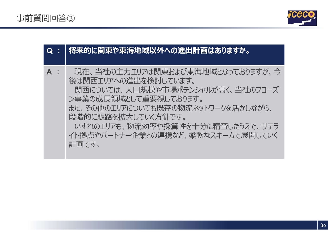 現在、当社の主力エリアは関東および東海地域ですが、今後、関西エリアへの進出を検討しています。関西については、人口規模や市場ポテンシャルが非常に高いことから、当社のフローズン事業の成長領域として重視しています。