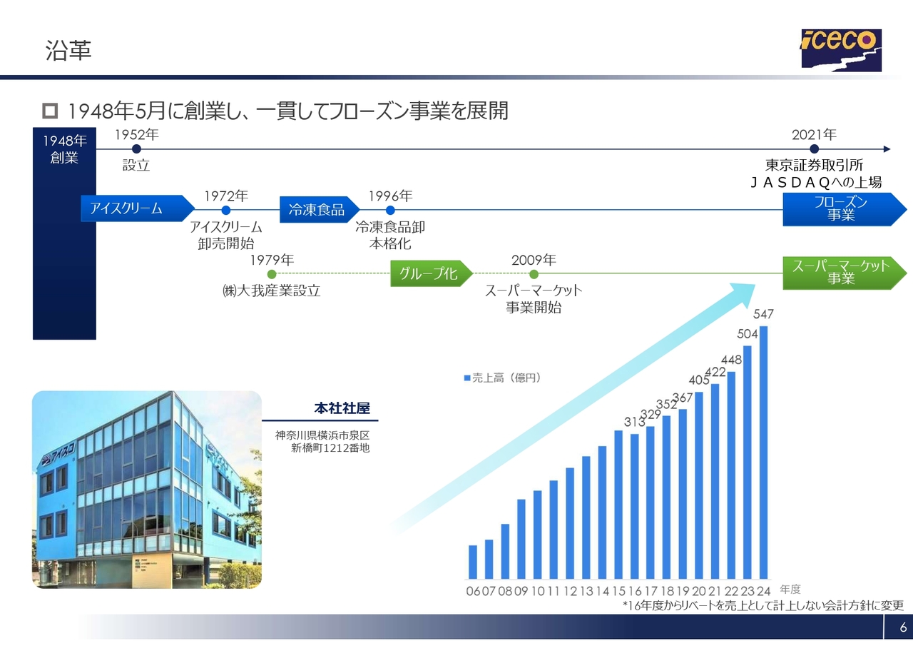 沿革についてご説明します。当社は1948年に創業しました。創業当初はアイスキャンディーの製造販売を行っていましたが、1954年にアイスクリームの製造販売へ事業を転換し、1972年にはアイスクリームの総合卸売を開始しました。また、1996年には冷凍食品の卸売業にも本格参入しました。