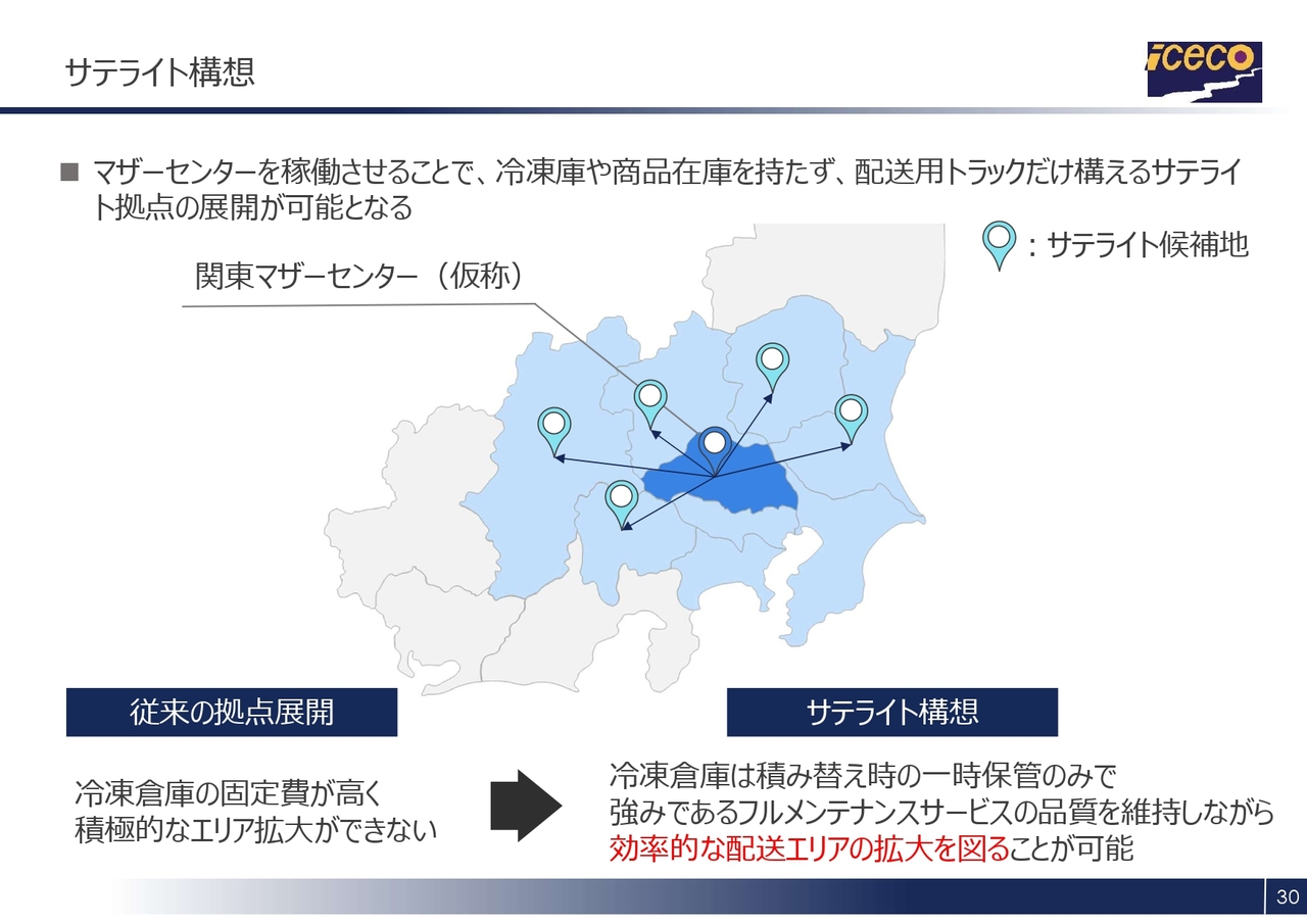 現在、埼玉県で建設を進めている関東マザーセンターは、当社フローズン事業の中核を担う物流拠点として位置づけています。この関東マザーセンターの稼働に合わせ、関東近郊を中心にサテライト拠点の展開を順次拡大していく計画です。