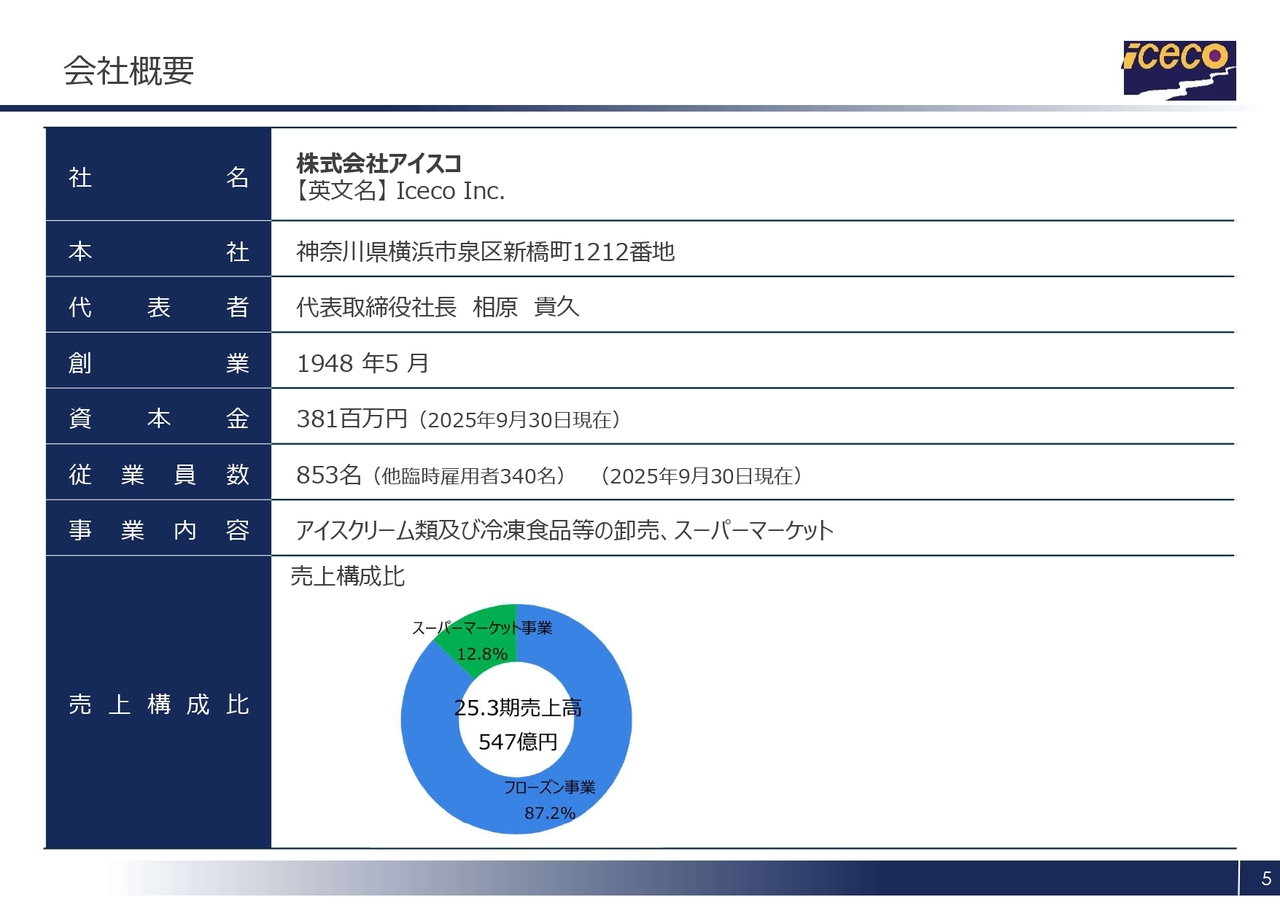 会社概要については、スライドのとおりです。事業内容として、当社はフローズン事業とスーパーマーケット事業の2つのセグメントを有しています。