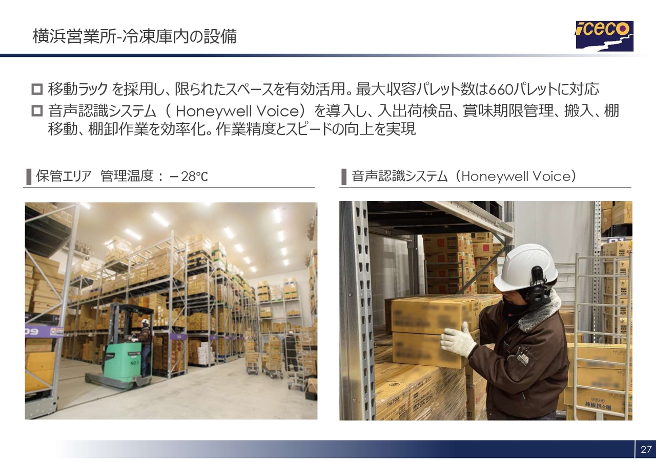 さらに、作業効率化と精度向上を目的に、音声認識システム「Honeywell Voice(ハネウェルボイス)」を活用しています。これにより、入出荷検品や賞味期限管理、搬入、棚移動、棚卸といった作業を音声指示によってハンズフリーで行うことができ、作業のスピードと正確性が大幅に向上しています。