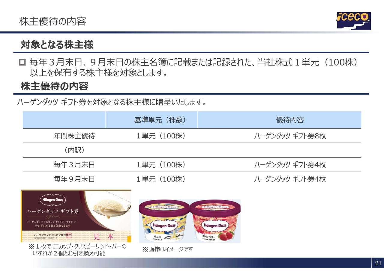 株主のみなさまの日頃からのご支援に感謝するとともに、当社株式への投資の魅力を高め、より多くの方々に当社株式を保有していただくことを目的に、3月末日および9月末日の株主名簿に記載された株主に対し、各4枚、年間8枚の「ハーゲンダッツ」ギフト券を株主優待として贈呈します。