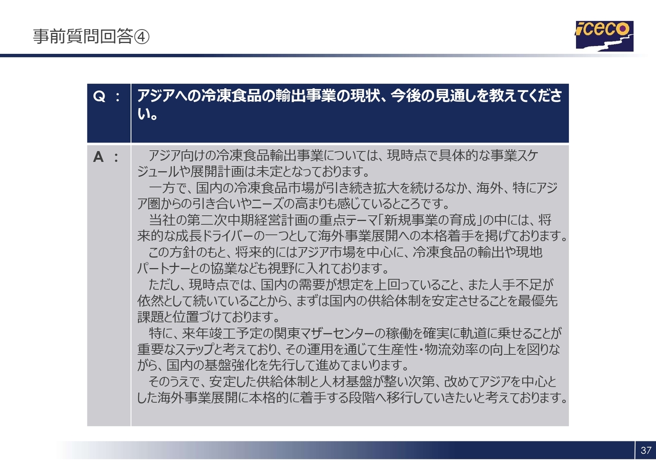アジア向けの冷凍食品輸出事業については、現時点で具体的な事業スケジュールは未定です。一方で、国内の冷凍食品市場が引き続き拡大する中で、海外、特にアジア圏からの引き合いやニーズの高まりを感じています。