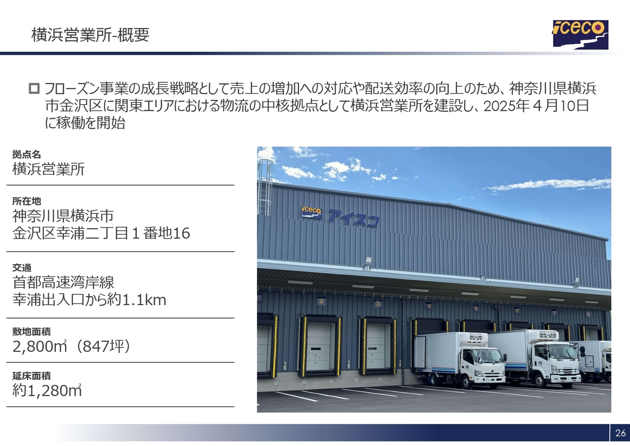 第二次中期経営計画の重点テーマの1つ「収益力の改革加速」に掲げたフローズン事業の成長戦略の一環として、売上増加対応や配送効率向上を目的に、関東エリアにおける物流拠点の中核の1つとして神奈川県横浜市金沢区に横浜営業所を建設し、2025年4月から稼働を開始しました。