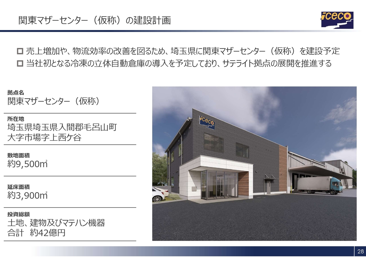総投資額は42億円で、当社として過去最大規模となります。このプロジェクトを通じて、フローズン市場の成長を確実に捉え、「ICECO VISION 2030」実現に向けた中核拠点として、着実にプロジェクトを進めていきます。