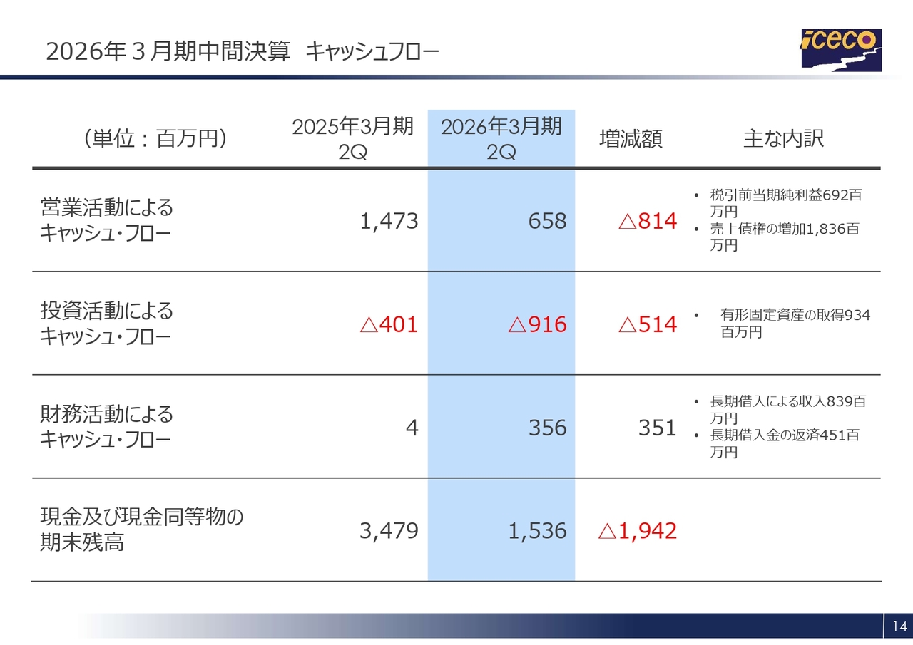 キャッシュ・フローについては、スライドのとおりです。投資活動によるキャッシュ・フローでは、フローズン事業における横浜営業所の建設や関東マザーセンター関連の支払いにより、有形固定資産への支出が約9億3,400万円発生しました。