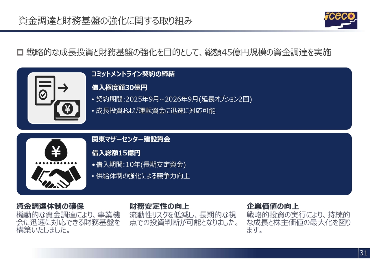 1点目は、コミットメントライン契約の締結です。借入限度額は30億円で、成長に伴う運転資金の増加や将来の投資機会への迅速な対応を目的としており、財務基盤のさらなる安定性につながるものです。2点目は、関東マザーセンター建設資金の借入です。借入期間は10年間です。