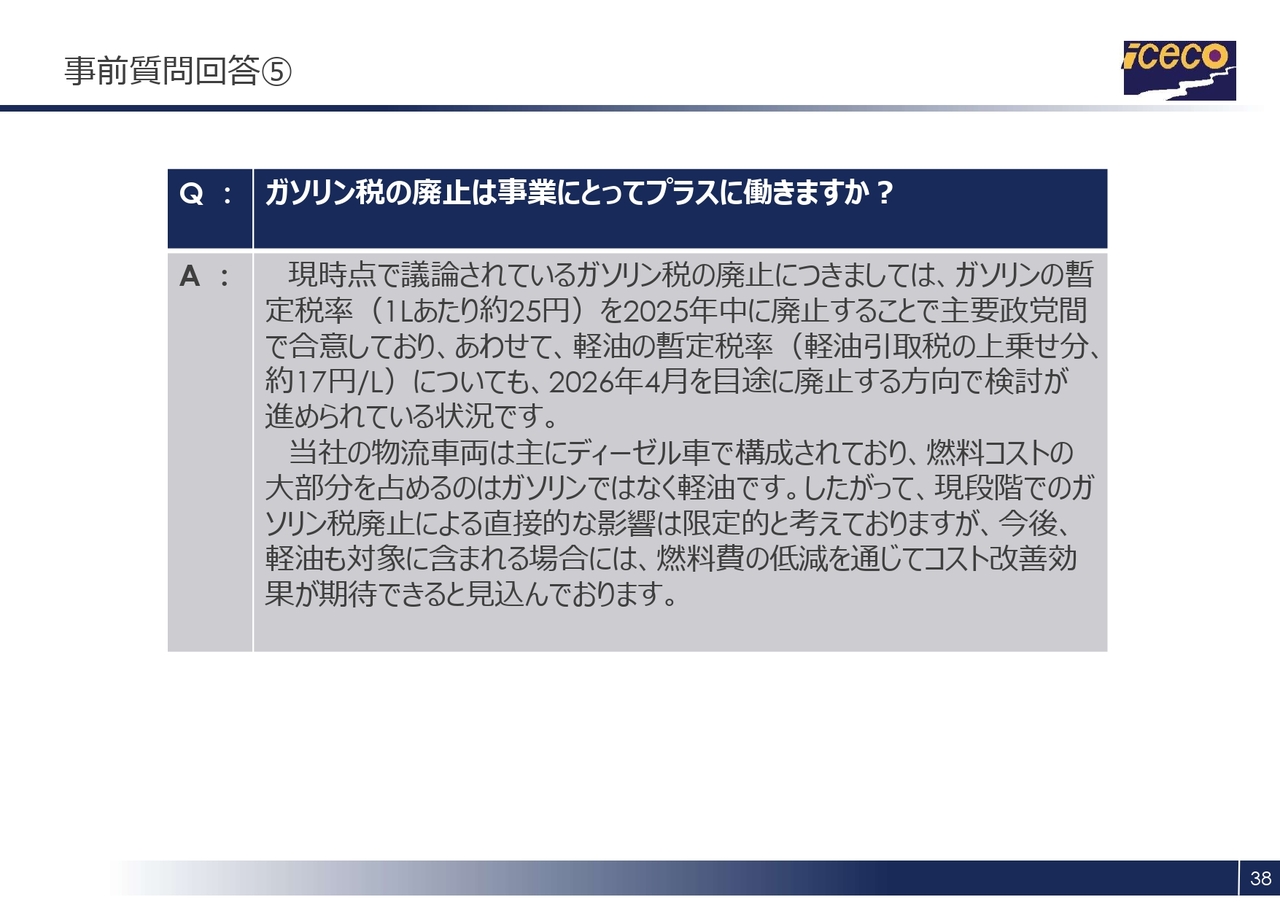 当社が物流で使用している車両は主にディーゼル車であり、燃料コストの大部分を占めるのはガソリンではなく軽油です。そのため、現時点でのガソリン税廃止による直接的な影響は限定的と考えています。ただし、将来的に軽油も対象に含まれる場合には、燃料費の低減を通じてコスト改善効果が期待できると見込んでいます。