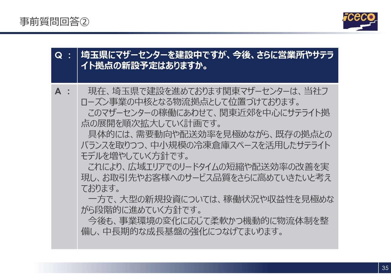 「埼玉県に関東マザーセンターを建設中ですが、今後、さらに営業所やサテライト拠点の新設予定はありますか?」というご質問です。