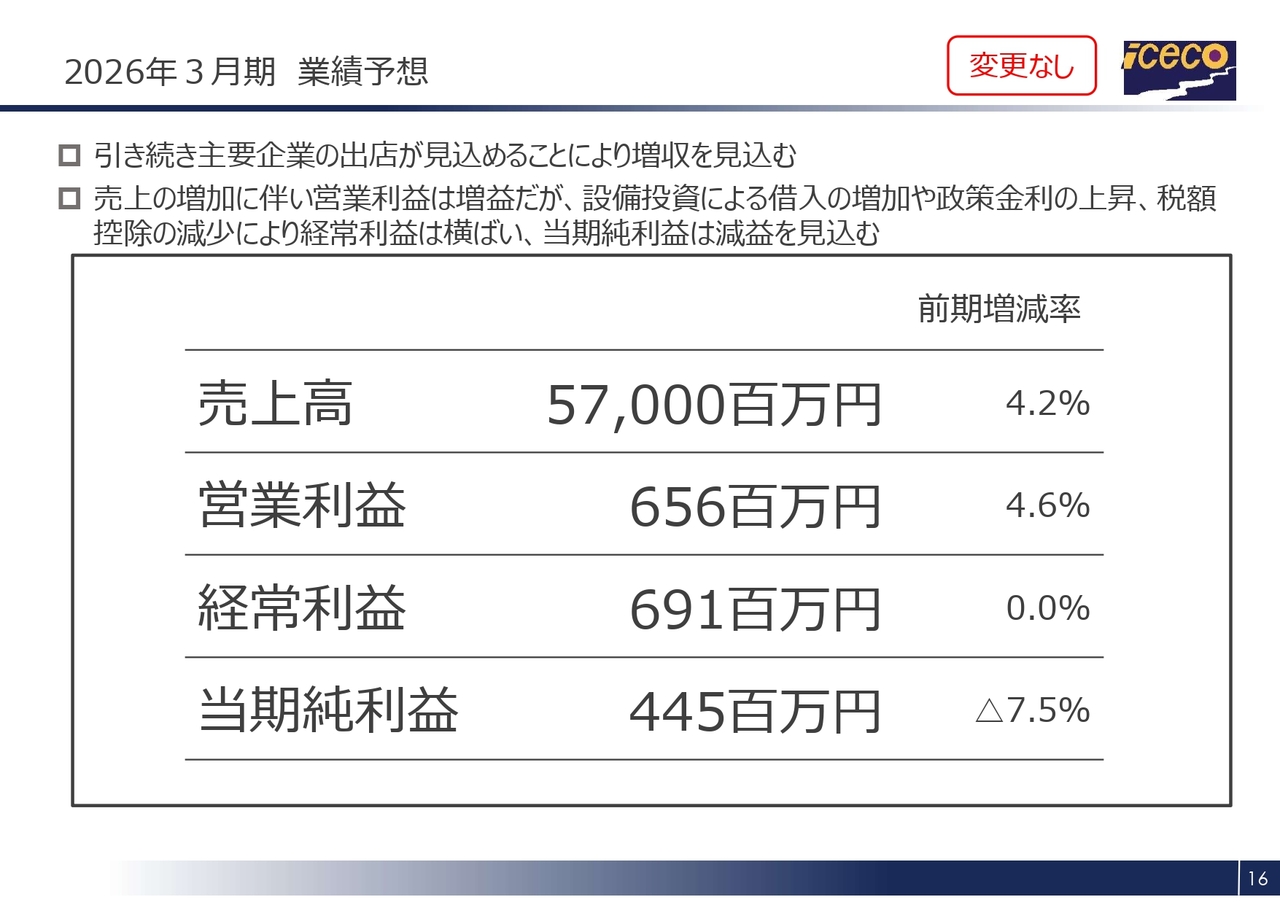 2026年3月期通期の業績予想についてご説明します。2026年3月期の業績予想については、中間期の変更はありません。
