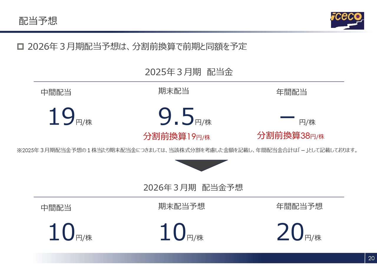 期末配当予想についても1株当たり10円とし、年間20円となります。前期は株式分割を考慮すると年間19円相当だったため、1円の増配となります。