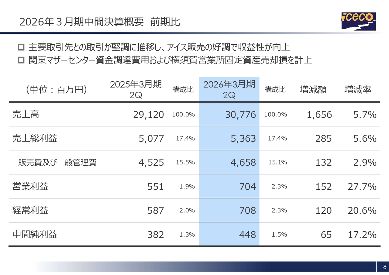 2026年3月期の中間決算概要です。前期比較の分析となります。当期はドラッグストアを中心とした主要得意先の出店が堅調に推移したことなどにより、売上高は前期比5.7パーセント増の307億7,600万円となりました。
