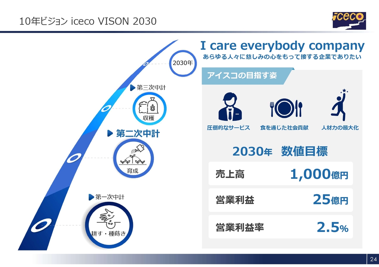 中間期のトピックスをご説明します。当社は10年ビジョン「ICECO VISION 2030」において、「圧倒的なサービス」「食を通じた社会貢献」「人材力の最大化」という3つの目標を設定しています。卸売業界でオンリーワンのポジションを確立し、収益力でフローズン業界No.1を目指しています。