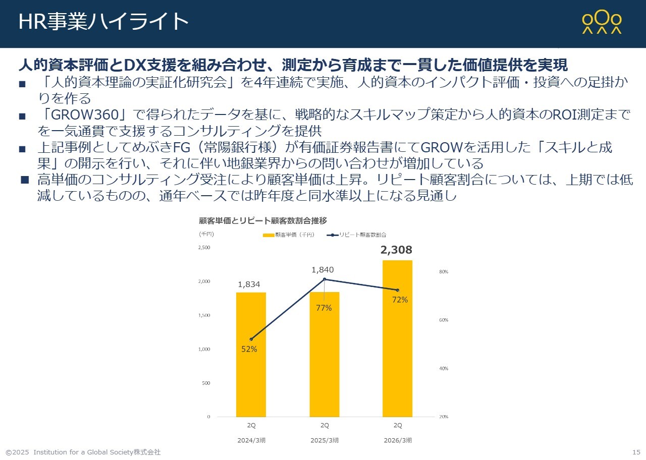 まず、HR事業については、売上が非常に伸びている状況です。ご存じのとおり、上場企業においては有価証券報告書での人的資本開示が義務化されており、さらに来年の有価証券報告書からは、戦略とのひも付けが義務付けられるようになりました。このような流れによって、人的資本を定量的に把握する必要性が高まっています。