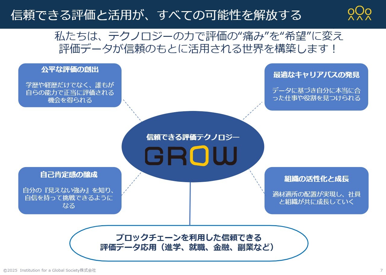 私たちが描く未来の姿は、個々人が私たちの「GROW」の評価をさまざまなかたちで幼少期から受け、それをポータブルなデータとして持ち歩く時代の実現です。
