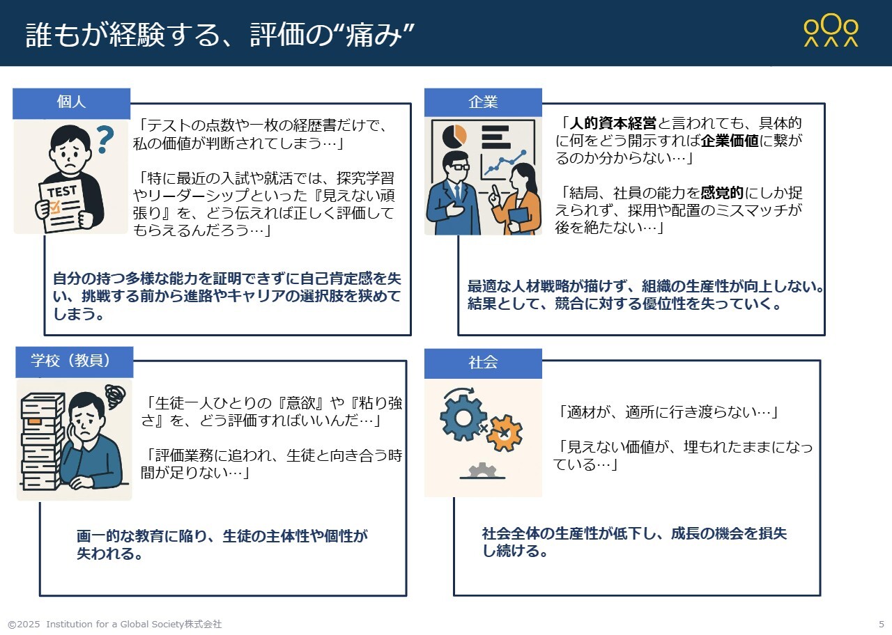 スライドに記載があるように、テストの成績だけで価値が判断されたり、企業の採用において学歴で判断されたりする状況があります。その学歴も結局はペーパーテストで多くが決められてしまい、それによって価値が固定される現状があります。