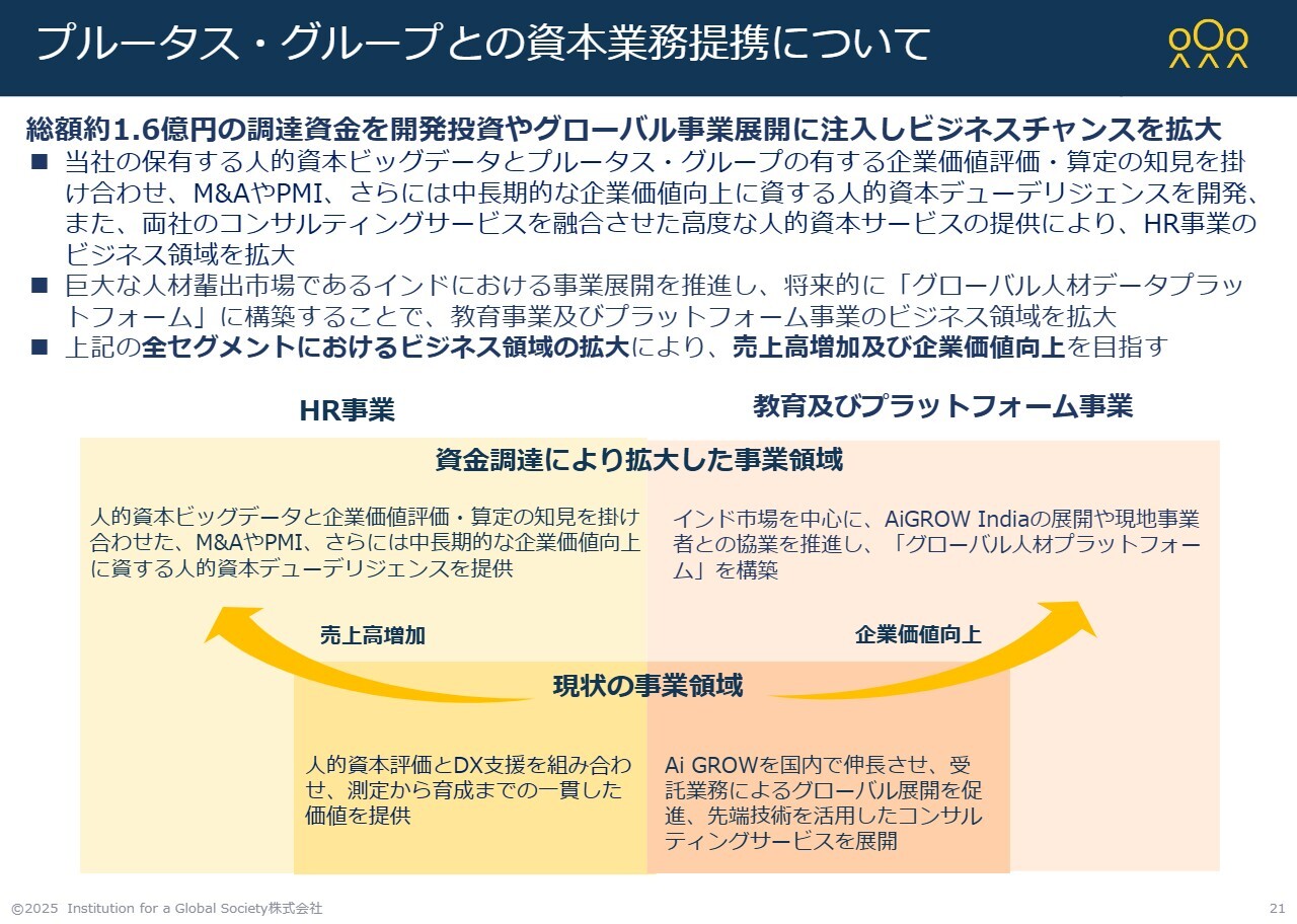 こうした背景を踏まえ、今回、プルータス・グループと連携し、約1億6,000万円の資金調達を行いました。この調達により、同グループとのPost Merger Integration(PMI)に関する取り組みや、中長期的な企業価値向上に資する人的資本デューデリジェンスを実施していきます。
