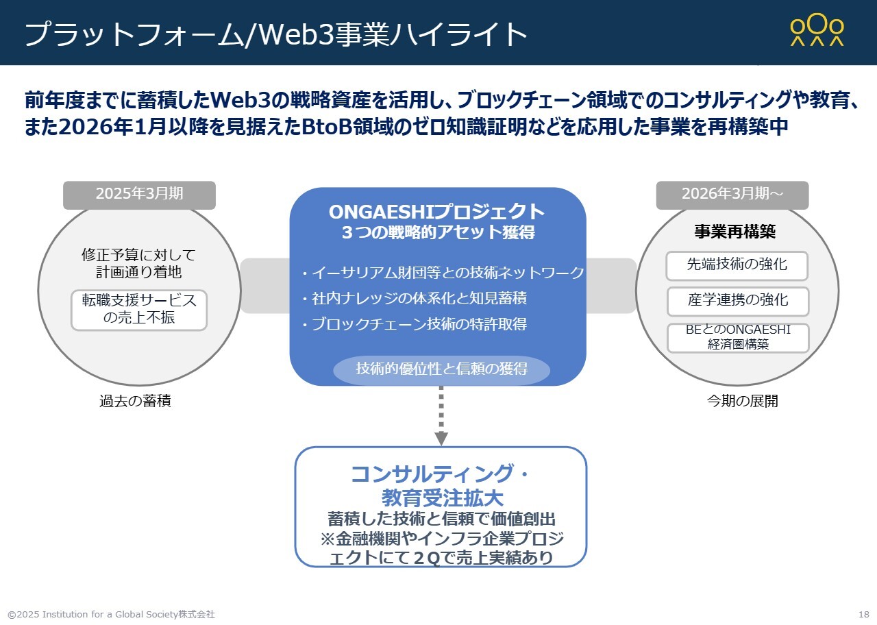 一方で、PF/Web3事業については、9月までは転職支援的な仕組みとしてブロックチェーンを活用していましたが、9月時点で国内における転職支援事業を停止し、次の新しい事業への転換期を迎えています。