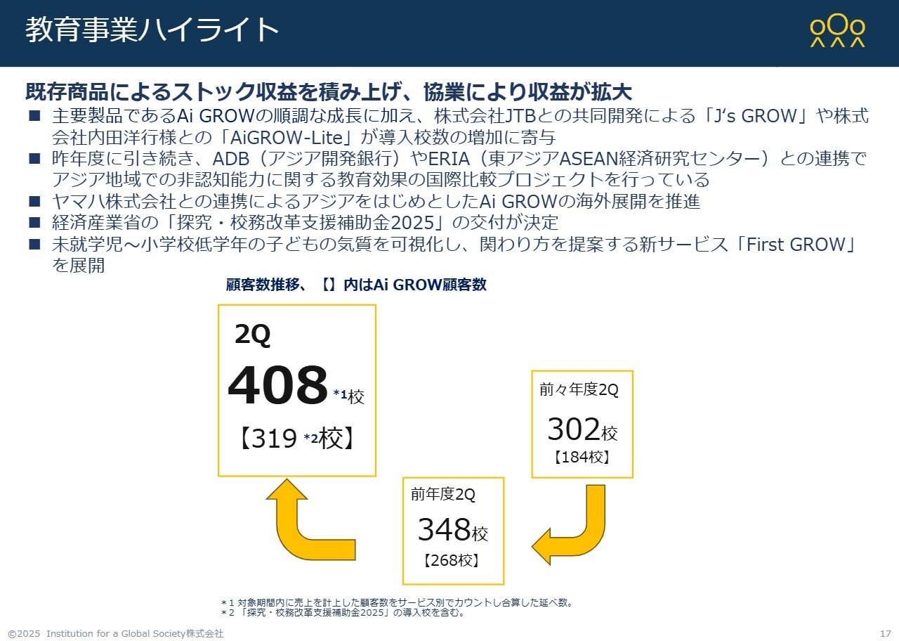 次に、教育事業についてです。教育は毎回大きく変化するものではなく、着実に積み上げていくものです。私たちが提供する「Ai GROW」は、企業で広く活用されている360度評価を学校に導入する取り組みを行っています。
