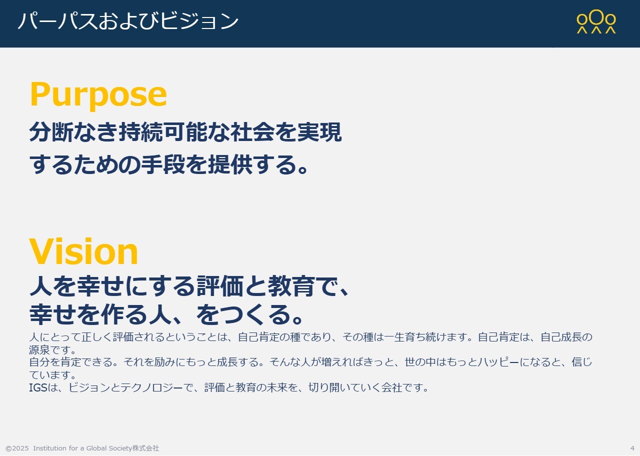 まず、簡単に当社についてご説明します。スライドのビジョンおよびパーパスにも記載しているとおり、当社にとって非常に重要なサービスとして「評価」があります。また、「GROW」というAI評価システムも提供しています。