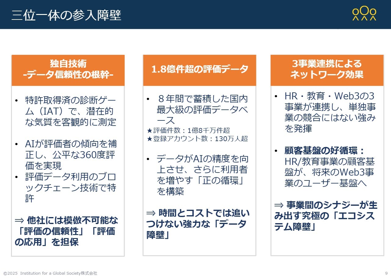 これにより、HR事業と教育事業を一気通貫で提供できる体制を構築するとともに、PF/Web3事業においてもブロックチェーン技術でこれをポータブルに運用できる点は、当社の大きな強みとなっています。