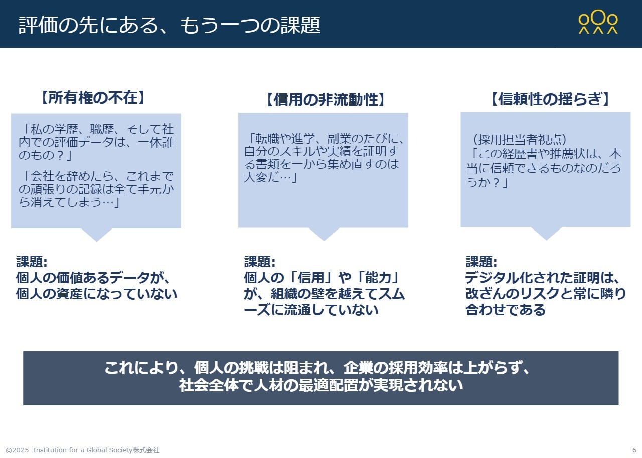 ブロックチェーンを暗号技術と併用することで、個人が自らのデータをコントロールできるようになってきています。こうした「所有権の不在」「信用の非流動性」「信頼性の揺らぎ」といった課題を解決する技術を持っていることも、私たちの強みです。
