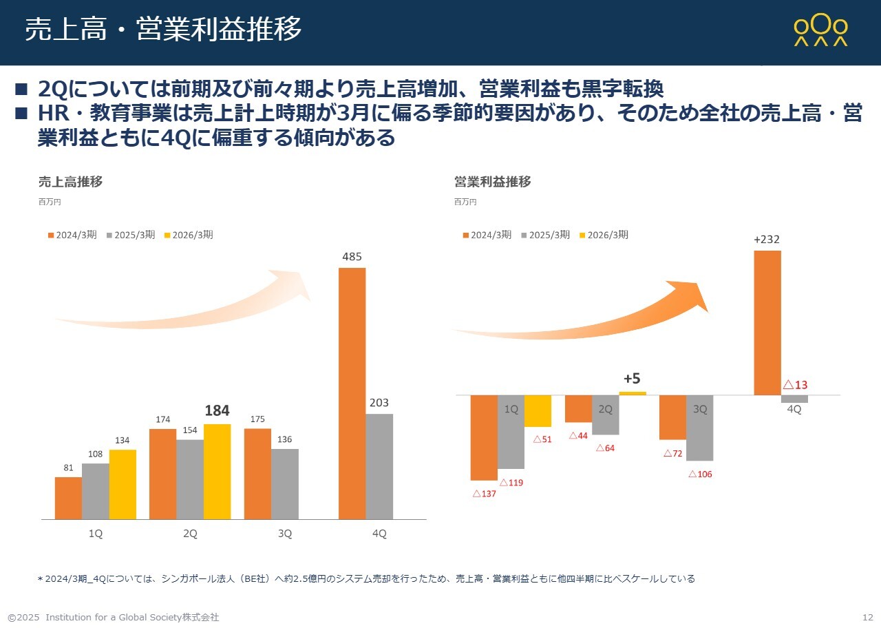 当社は年間の季節要因として第4四半期に売上が大きく上がりやすい特性があります。このため、第1四半期および第2四半期については、他の教育業者や研修会社などと同様に、第2四半期まで赤字が続くという業界的な特徴があります。