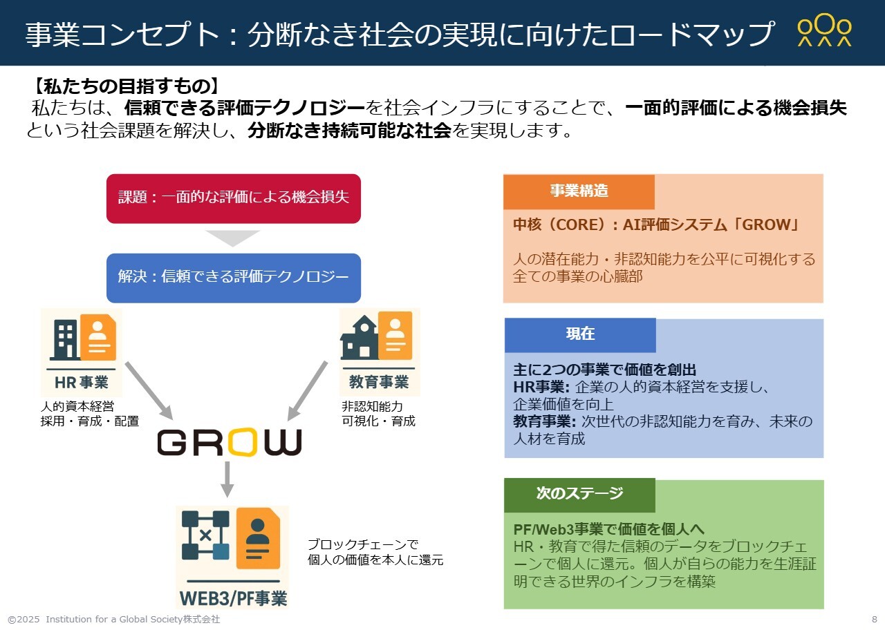 企業が当社の評価モデルを利用する場合はHR事業、学校が導入する場合は教育事業、そしてこのデータを個々人がなんらかのかたちで活用し、ブロックチェーン上で組み合わせながら運用するのがPF/Web3事業です。