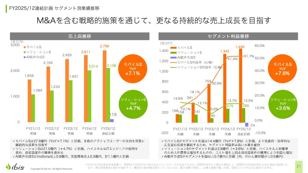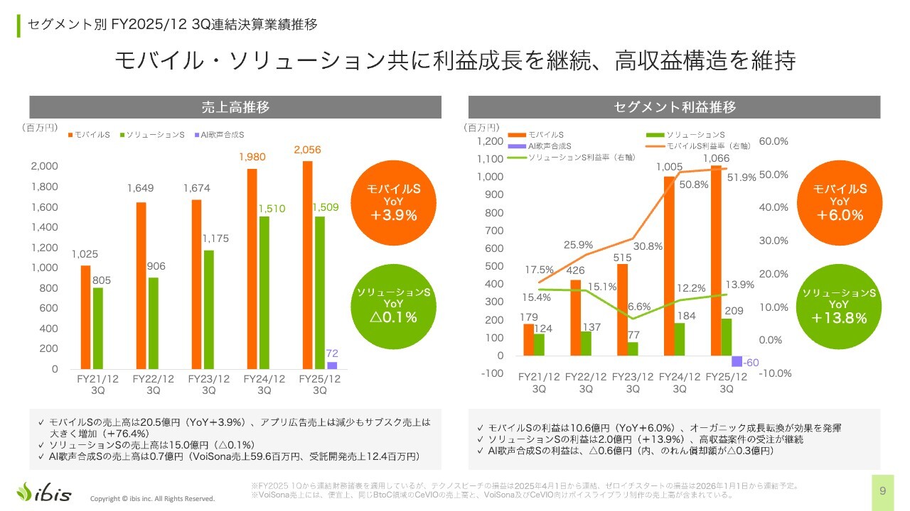 続きまして、セグメント別のグラフです。売上高の推移はスライド左側に示されています。モバイルセグメントはYoY3.9パーセント増、ソリューションセグメントはYoY0.1パーセント減、AI歌声合成セグメントは7,200万円です。